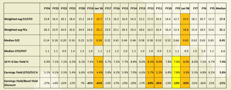 On the fundamentals side, a recent memo from Sage One Investment highlights that Indian companies are in a healthier position than they’ve been at previous market peaks. Debt-to-equity ratios are at historic lows (0.14 for FY24 compared to 0.26 in 2018). Additionally, the EV/CFO ratio (Enterprise Value to Cash Flow) is lower than in 2018 and 2008, suggesting there’s room for growth before reaching overvaluation territory.