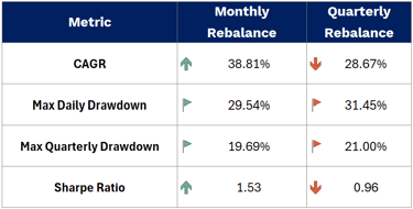 Monthly and quarterly strategies each have their strengths, but the monthly rebalance model demonstrated stronger performance over the long term, with higher CAGR and a better risk-adjusted return (Sharpe ratio).