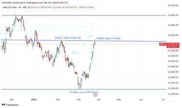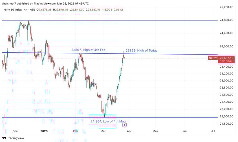 The market has rallied sharply off its March 4 low of 21,964, reaching a new swing high of 23,869 on March 24 — surpassing the previous peak of 23,807 from Feb 5. However, it’s crucial to recognize that: